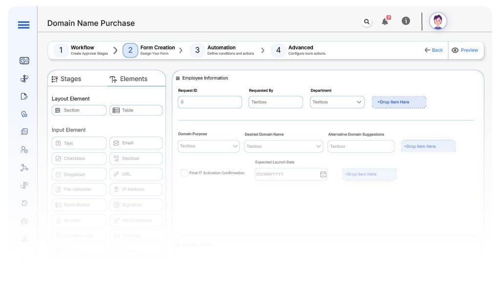 - Custom Domain Request Forms: Cflow allows IT or Marketing to submit detailed domain purchase requests, including use-case, preferred domain name, urgency, and suggested registrars. Conditional logic adapts fields based on requester department or domain type (e.g., internal vs. public).