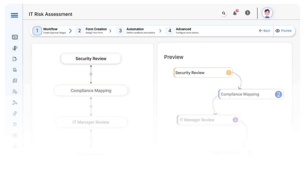 - Multi-Level Review Workflow: Each risk follows a structured workflow involving IT, Security, Compliance, and Leadership, based on criticality. Steps are sequenced with notifications and SLA-based escalations to avoid delays. This ensures proper risk ownership and accountability at every level.