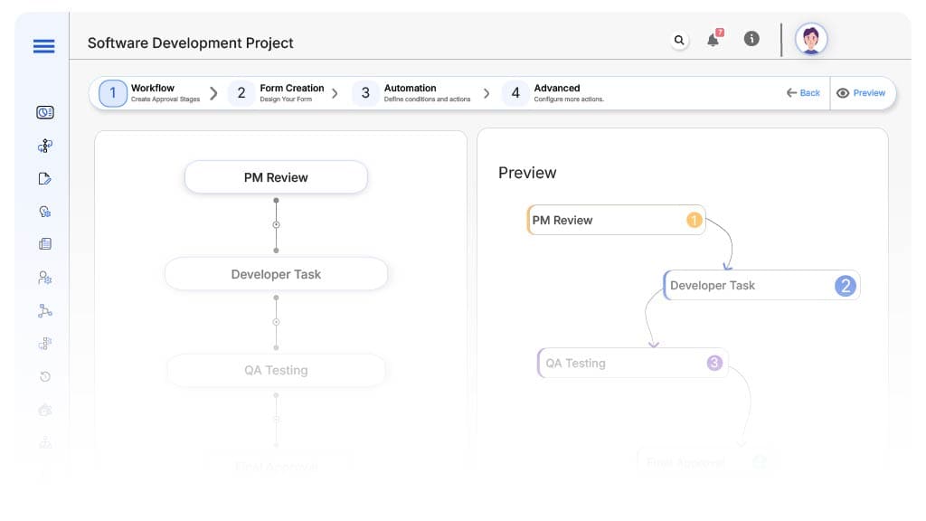 Software Development Project Automation refers to the use of no-code workflows and rule-based logic to orchestrate each stage of the software development lifecycle. From capturing project requirements to managing development sprints, review gates, test signoffs, and release cycles – the entire process is automated.