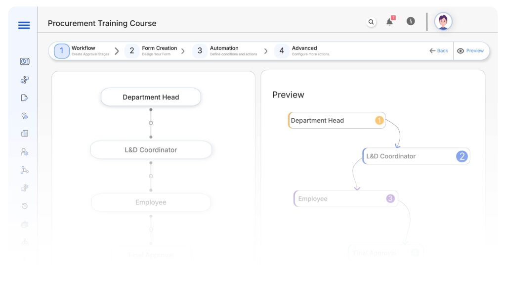 Go to Cflow → Workflows → New, and name it “Procurement Training Course Automation.” Define purpose as digitizing nomination-to-certification training flow.