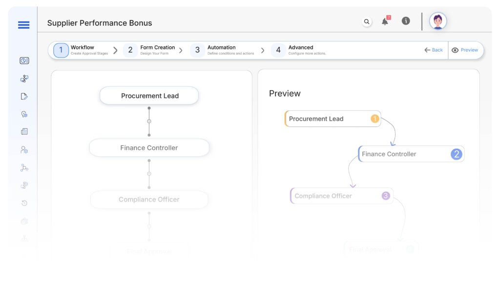 Go to Cflow → Workflows → New, name it “Supplier Performance Bonus Automation,” and define its purpose.
