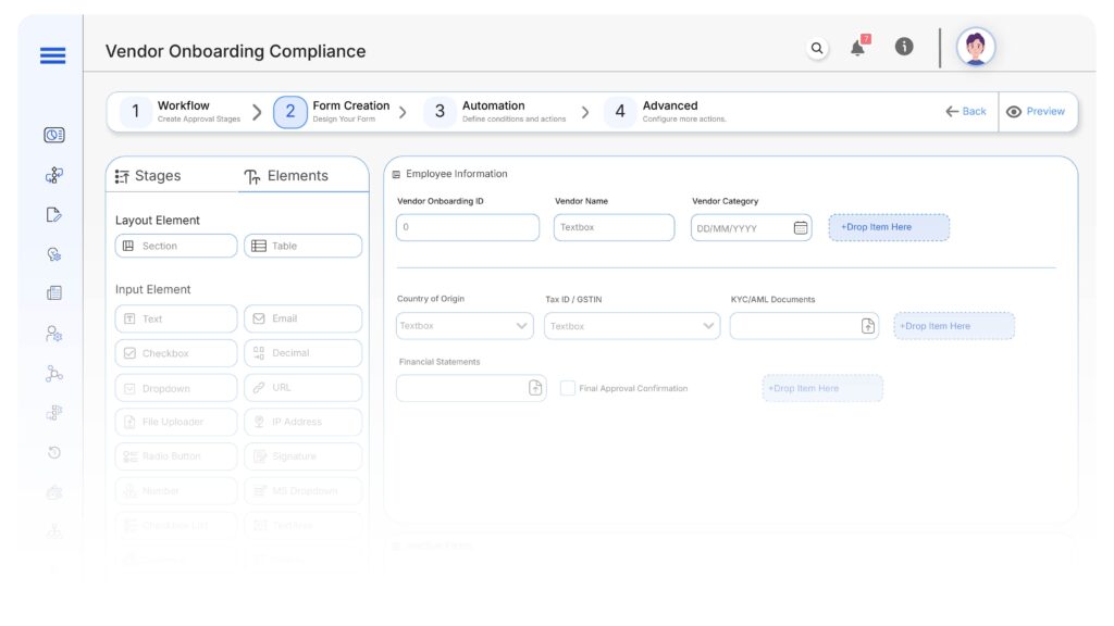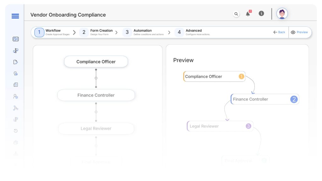 Go to Cflow → Workflows → New → Name “Vendor Onboarding Compliance Automation.”