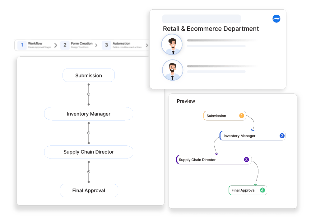 Retail managers can create custom approval workflows for stock transfer requests with the visual workflow builder in Cflow. These workflows automatically route them to the relevant stakeholders for timely review.